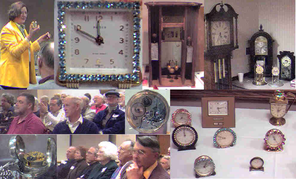 An overflow crowd at the regular meeting on February 4 saw and heard about Phinney-Walker clocks, until now more often ignored or discarded than collected. The program was presented by an enthusiastic new collector from Memphis, Dr. Edna Davis. She explained how she came to specialize in these little clocks; how she has proceeded in researching the history and connections of the companies involved around the world (including Lux and especially Semca); and how, in pursuit of every example illustrated anywhere, she has crossed paths with--and learned from--collectors whose main interest is not clocks as such, but rather rhinestones or cigarette lighters or even Disney memorabilia.