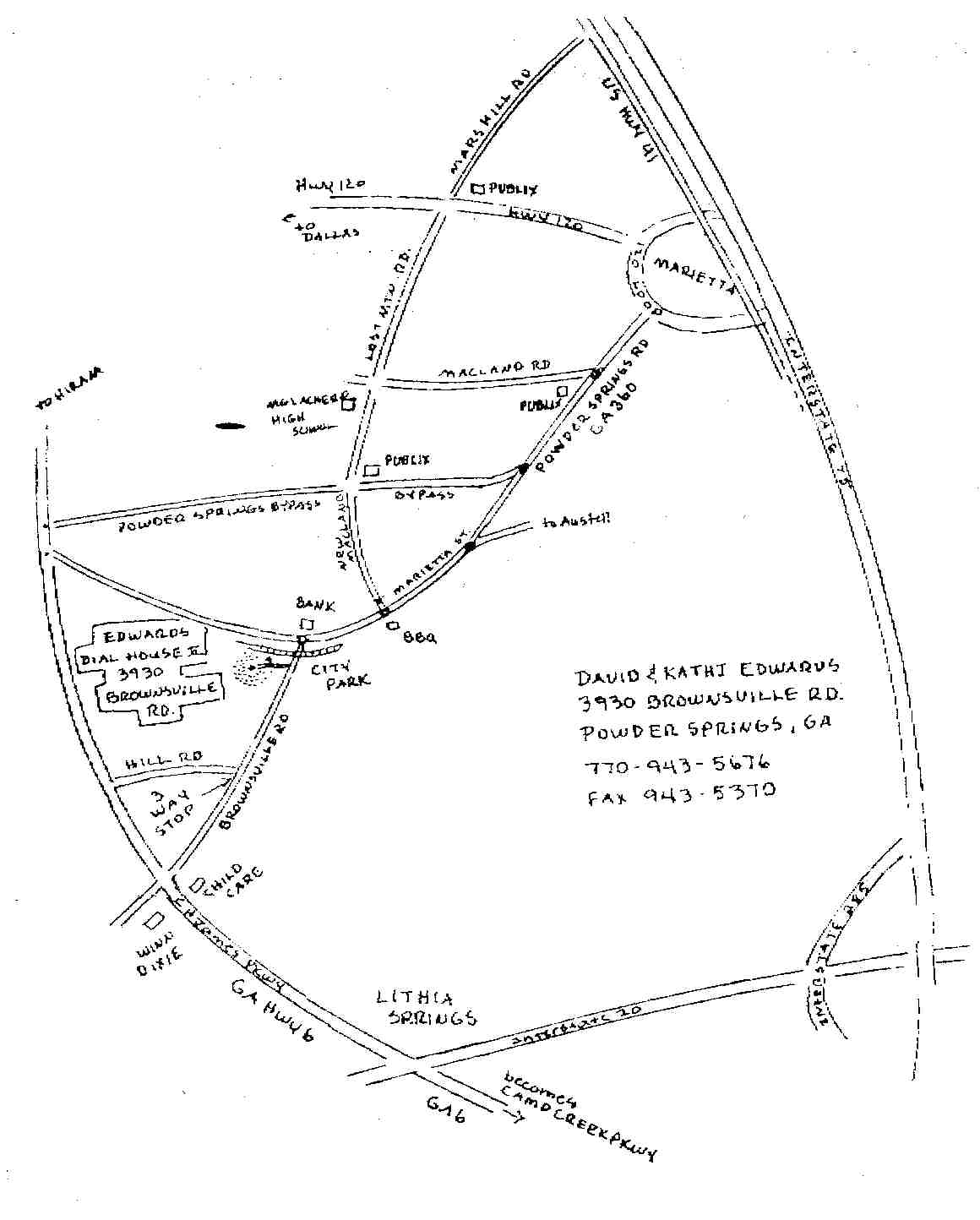 We're trying something a little different for the June meeting: a covered dish picnic at Kathi and David Edwards' home in Powder Springs (see map and directions below). The program will be a hands-on demonstration of stenciling, or bronzing, and will be given by Charles Schubert of Portland, Oregon. This meeting in particular is open to any and all clock enthusiasts. Please bring a pot-luck dish corresponding to the beginning letter of your last name: A-E, fruit or desserts; F-K, vegetables and casseroles; L-R, crackers, chips, bread, and rolls; and S-Z, dips, cheese, pickles, and olives.