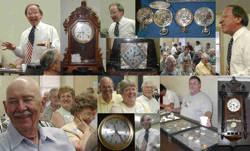 The subject of the watch focus group and display at the August meeting was Hampden's 18-size watches. A number of interesting examples were brought by Jim Davis, Ed Brown and others. Although not intended to be limited to those watches accepted for railroad time service, such watches, both hunting-case and open-face, comprised the majority of the display. There were a number of 18-size, 15 and 17 jewel standard watches from 1884 to 1910, many with tu-tone damaskeening and a few with gilt trim. The watches were surrounded by copies of a number of ads and a trade press article heralding Hampden's promotion of its new line of 17-jewel movements and eventual move into 21 and 23-jewel watches. On the side, John Cheves and Kent Singer showed several 18-size, 21 and 23-Jewel watches made by Gallet (of Switzerland) for the T. Eaton Co., a major Toronto-based mail-order house. A 23-jewel, Waltham model `92 Vanguard was there for comparison since the T. Eaton watches bore a strong resemblance to it. The subject of the focus group and display for the October meeting is Illinois 18-size watches. As always, we appreciate seeing the watches that members are kind enough to bring.