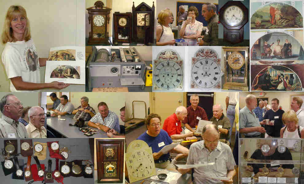 Kathi Edwards was our main speaker. She, along with her mother and father - Richard and Martha Smallwood, has been restoring clock dials for many years. They are considered the gold standard of dial restoration. Kathi's presentation on painted metal dials, profusely illustrated with slides and with color reproductions that were passed around, captured the attention of the audience from the first minute. Kathi traced the development of dial painting from its beginning in 18th century England to the early and middle 19th work done by well-known dial painters here in the United States. She showed many examples of how the period of time was reflected in the style and content of these ornately painted clock faces.