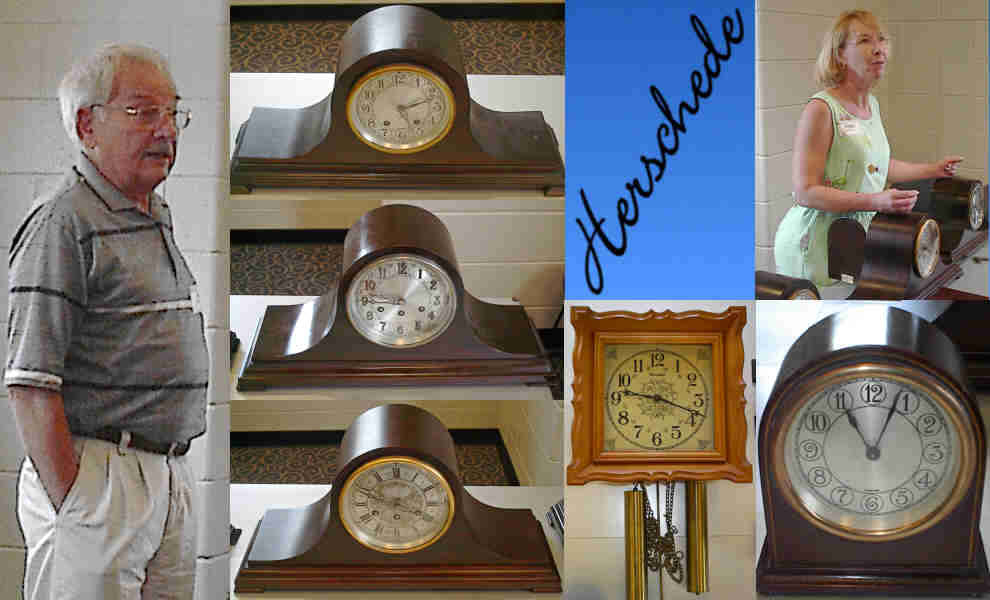 Members brought four Herschede clocks for exhibition, three tambours, and one late model wall clock with a German movement. One of the Herschede's had the "Canterbury Chime" which was developed for Herschede.