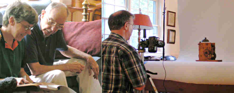 On a personal note, Ward Francillon asked if anyone would volunteer to help with a project of photographing his clock collection. They are being professionally photographed for a book in progress. Each clock needs to be moved to the photographing area and Ward would need help with moving them. Several of our members jumped at the chance to not only see the collection, but touch it too. Of course, they promised not to drool. (See the photos below of Ward and Anne Camp, and the photo session in progress.)