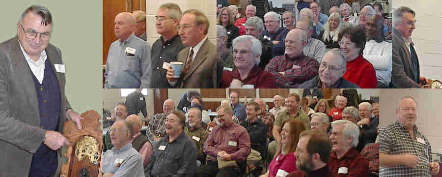 Our speaker, Tom Fowler gave us good "Advice for Buying Right." Although mainly pertaining to clocks, many of Tom's points apply to watches as well. Having information helps to make good buying decisions. The first thing is to read reference material to be familiar with what you want. Then, always take a few small tools with you. You'll need a screwdriver so you can remove the dial to see many inside. Do the movement and dial match or is it a Seth Thomas movement with an Ansonia dial and case? You can also see how the movement fits and if it is in the original mounting holes. If the case looks like Swiss cheese where the movement mounts, they probably didn't start life together.